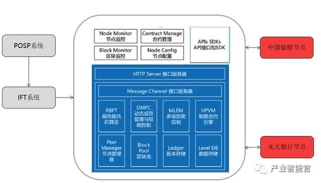 整个系统的架构如下图1所示,在封装好的Hyperchain平台外部,分别链接四个中国银联的节点和四个光大银行的Nginx节点(光大银行的每个Nginx节点分别与其四个节点相连),两家机构分别接入区块链节点。整个区块链系统通过一个IFT系统与POSP系统相连。