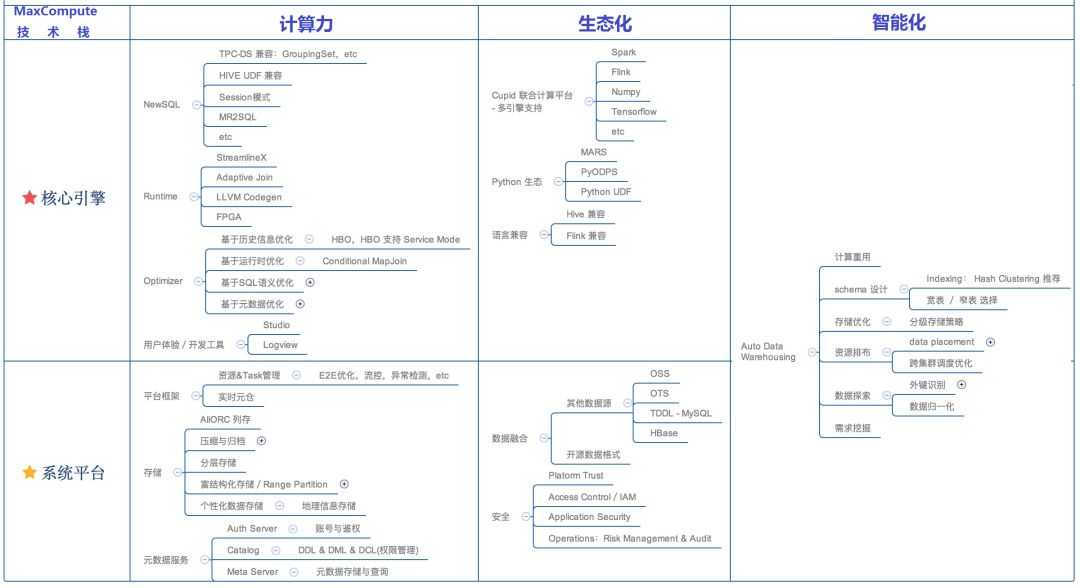 基于横向架构上的核心引擎和系统平台,MaxCompute 在计算力、生态化、智能化3个纵向上着力发展差异化的竞争力。