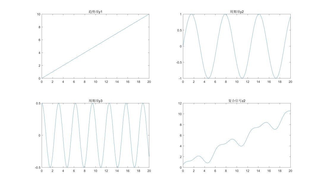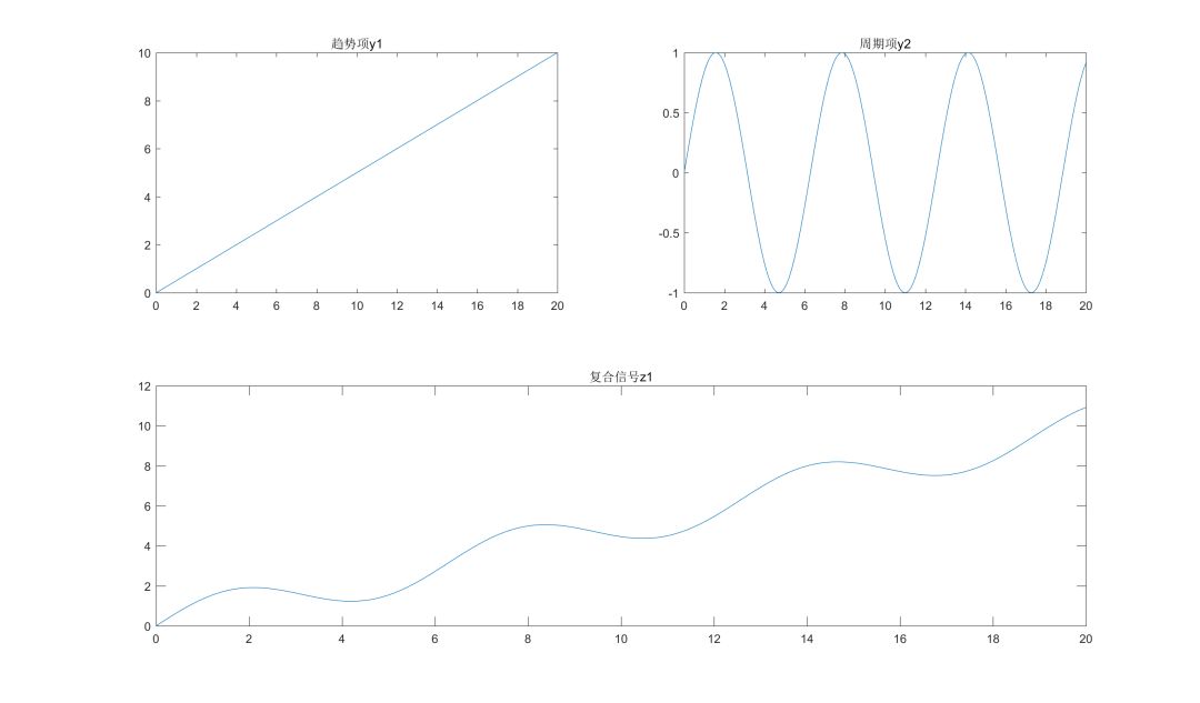 取趋势项y1=0.5*x,周期项y2=sin(x),复合信号z1=y1+y2,分别如下图所示: