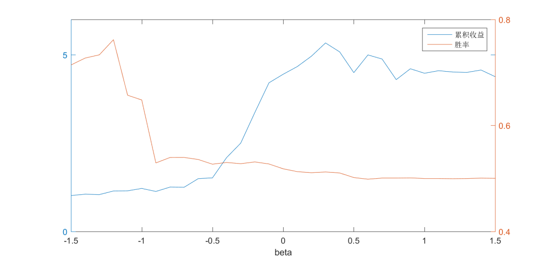 基于IF0000合约20110101至20161231期间的历史数据,我们测试了beta自-1.5至1.5间隔的策略效果。如下图所示,左轴表示策略的累积收益(在不考虑止损和交易费用的情况下)、右轴表示策略的胜率。从测试的结果来看,随着beta的增大,收益明显增加,直到beta=0.3时达到最大值,随后递减。而胜率则随着beta的增加一路递减,并最终稳定在0.5左右。