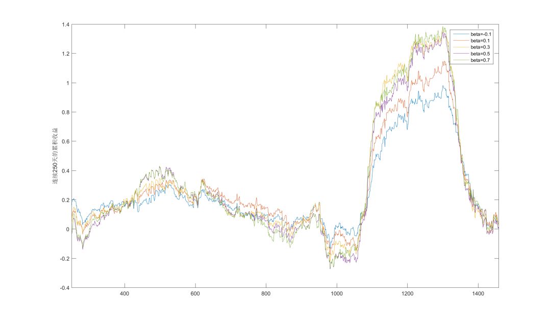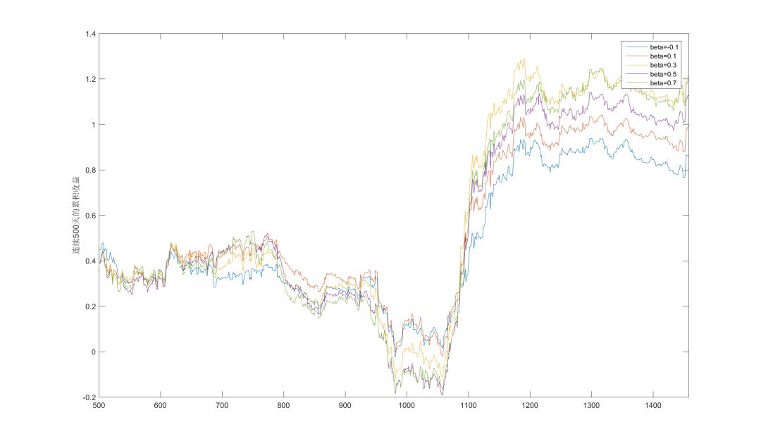下面两张图给出了beta取值从-0.1~0.7之间时,策略在连续250天和500天里的累积收益的变动情况。大体上可以看出几点: