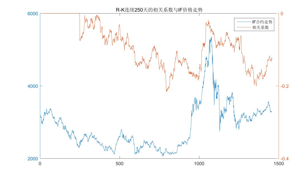 则基于沪深300股指期货主力合约(IF0000)20110101-20161231期间共计1458个交易日的数据计算得到的R和K的相关系数为-0.1055,可以说是相关性比较强的一个因子了。进一步地,我们考察该相关性的时间敏感性,下图给出了两者在连续的250个交易日里的相关系数,在我们的样本时间里,该相关系数始终小于0,最高时能超过0.2,尽管随时间波动较大,但对照同期IF合约的走势来看该相关关系的变化似乎与大行情的震荡或趋势并无明显关系。