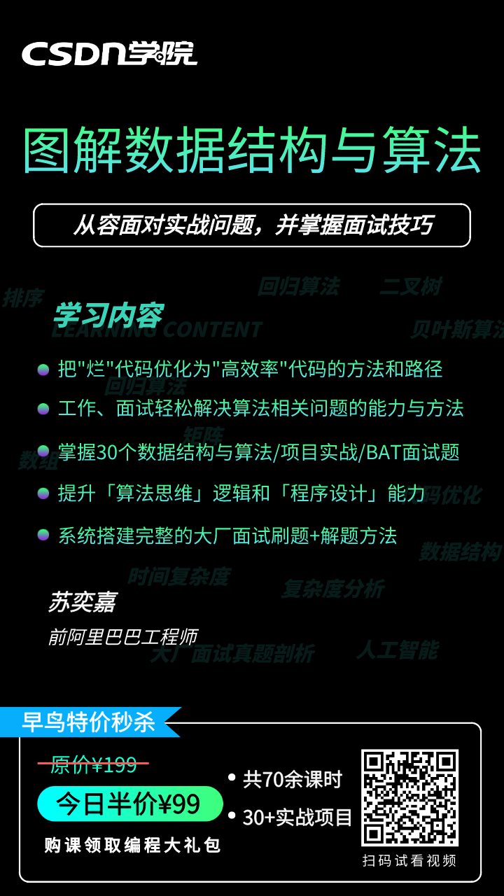 基于这个思路,为了让更多底子薄弱的程序员掌握数据结构与算法,我跟 CSDN 耗时6个月,共同打造了这门《图解数据结构与算法》课。