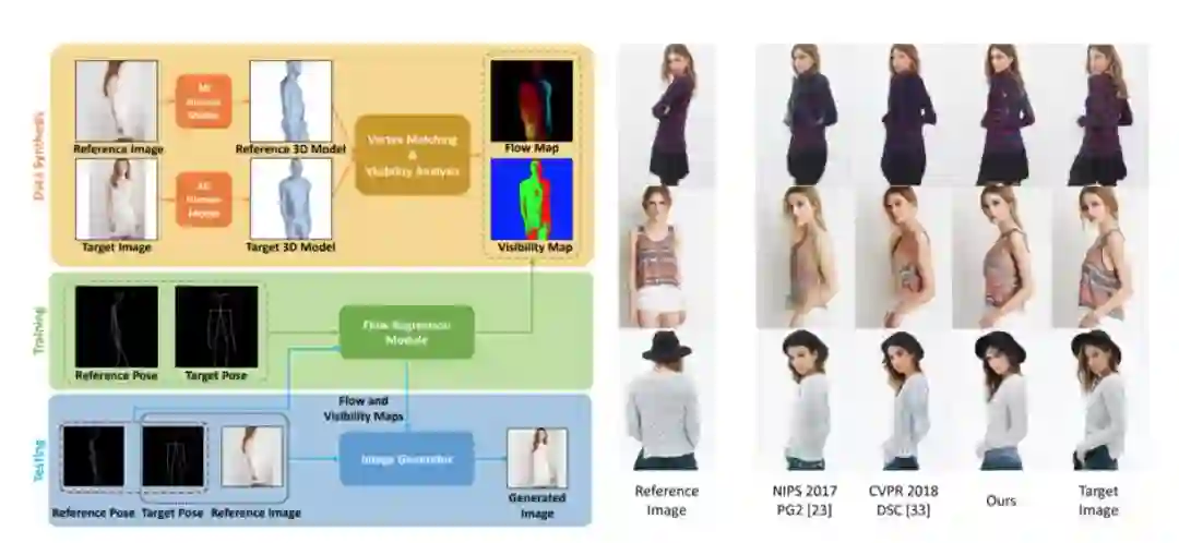 为此,他们设计了一个前馈神经网络模块,以原始姿态和目标姿态作为输入,迅速对光流场进行估计。考虑到真实光流数据难以获取,他们利用3D人体模型拟合图像中的人体姿态,生成对应姿态变化的光流场数据,用于模型训练。