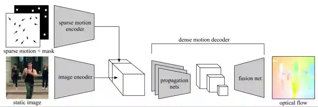 为此,作者提出了条件运动传播这个自监督学习任务。训练时,他们将单张图像作为输入,将目标运动场中抽样出来的稀疏运动场作为条件,训练神经网络去恢复目标运动场。这样训练完的图像编码器可以用来作为其他高级任务的初始化。他们在语意分割、实例分割和人体解析等任务中相比以往自监督学习方法获得了较大提升。