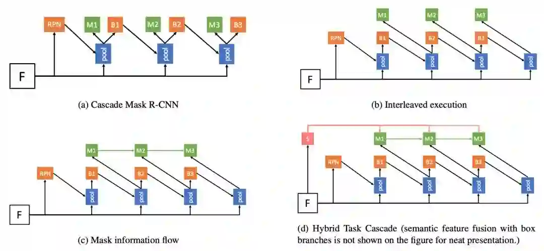 在这篇论文中,作者提出了一种新的框架Hybrid Task Cascade (HTC)。该框架是一个多阶段多分支的混合级联结构,对检测和分割这两个分支交替地进行级联预测,除此之外,他们还引入了一个全卷积的语义分割分支来提供更丰富的上下文环境信息。HTC在COCO数据集上相对 Cascade Mask R-CNN获得了1.5个点的提升。基于提出的框架,他们获得了COCO 2018比赛实例分割任务的冠军。