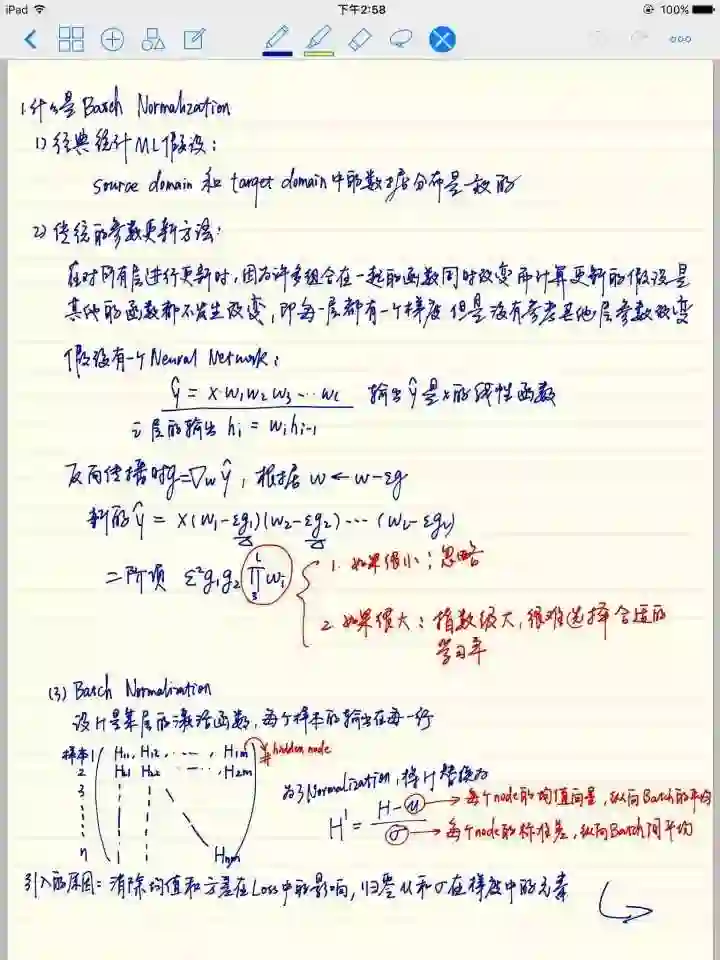 在具体介绍与v1版本的区别之前我想先直观地说一下batch normalization,因为在v3版本中使用了BN。这是我自己在ipad上记的笔记: