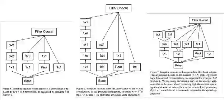 网络在很深的层次才使用了含有非对称卷积的Inception module,比如在8x8这种分辨率最低的feature map才使用了第三种Inception module,其原因是,这些最粗糙的网格,最靠近网络的末端,对于这些深层的网络来说,最关键的一点是要产生高维的稀疏表示,所以这些深层更需要的是局部处理(比如1x1的卷积得出的是最稀疏的结果),第三种Inception module是这三种模型中可以得到最稀疏结果的模型。