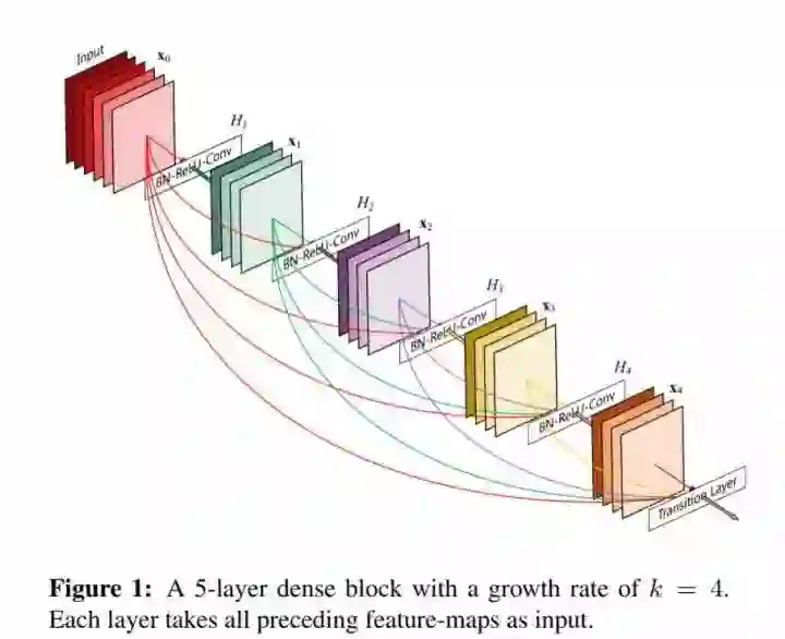 如图所示的结构就叫作Dense Block,它包括输入层在内共有5层,H是BN+ReLU+3x3Conv的操作,并不改变feature map的大小。对于每一层来说,前面所有层的feature map都被直接拿来作为这一层的输入。growth rate就是除了输入层之外,每一层feature map的个数。它的目的是,使得block中的任意两层都能够直接”沟通“。