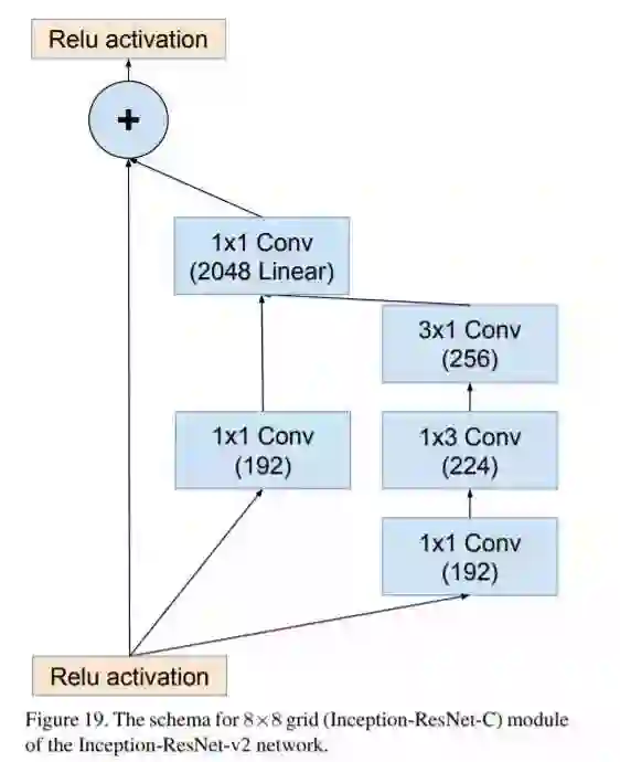 可见,对每个Inception-resnet模块而言,综合了之前版本的Inception模块版本和ResNet的残差单元。除此之外,Google还优化了一个性能与Inception-ResNet-v2相仿的Inception-v4版本,不多讨论,可以自行看论文,对每个Inception模块的优化情况。