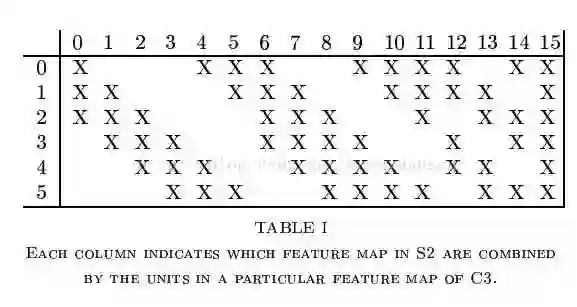 LeNet有一个很有趣的地方,就是S2层与C3层的连接方式。在原文里,这个方式称为“Locally Connect”,学习了CNN很久之后的一天,在回顾CNN原理的时候发现了这种神奇的连接方式: