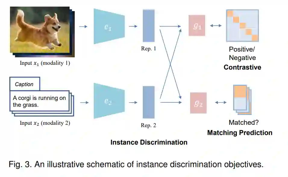 在单模学习中,实例判别(instance discrimination, ID)将原始数据中的每个实例视为一个单独的类,并对模型进行训练,以区分不同的实例。在多模态学习的背景下,实例判别通常旨在确定来自两个输入模态的样本是否来自同一个实例,即配对。通过这样做,它试图对齐成对模式的表示空间,同时将不同实例对的表示空间推得更远。有两种类型的实例识别目标:对比预测和匹配预测,这取决于输入是如何采样的。