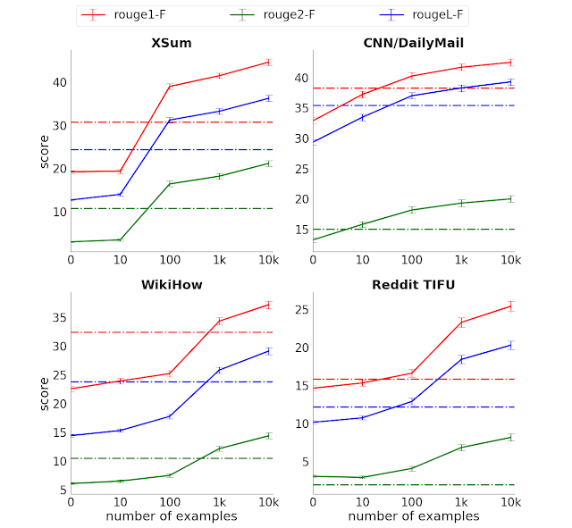 ROUGE 得分(三种变体,分数越高越好)对比四个所选摘要数据集中监督示例的数量虚线表示 Transformer 编码器-解码器没有预训练时,使用全监督的性能