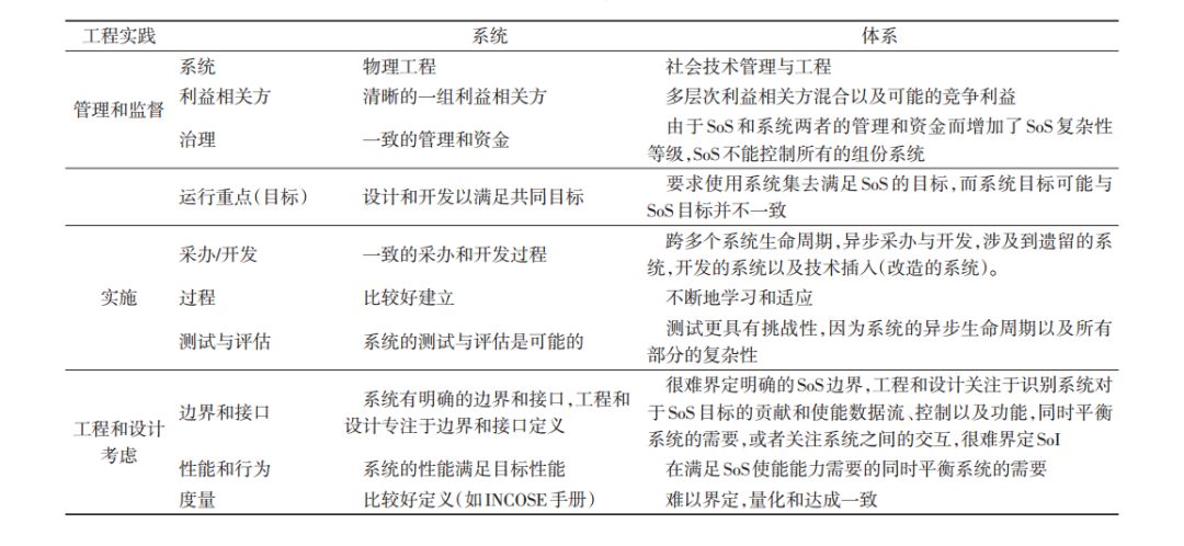 表1 系统与体系的区别(两者都适用于系统工程(SEBOK)