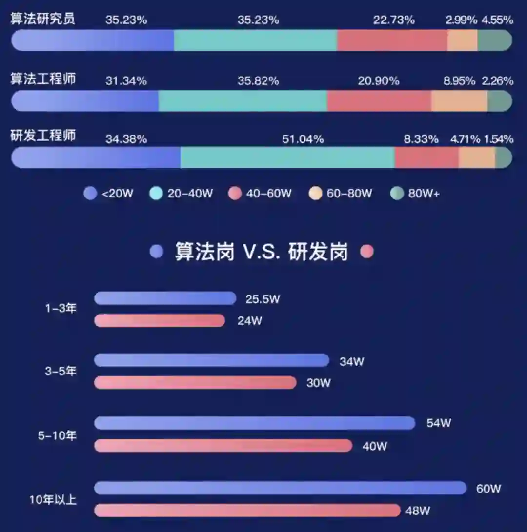 2020年,CV领域算法工程师平均年薪34.85万,算法研究员为32.90万,研发工程师为29.43万;算法岗位的中高收入人数占比远高于其他岗位。