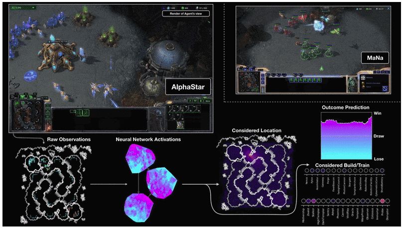 图2:AlphaStar 和 MaNa(顶级人类玩家)对战的可视化。图中展示了 AI 眼中的游戏:包括输入到神经网络的原始信息,神经网络的内部激活单元,一些备选的动作以及输赢的概率等。