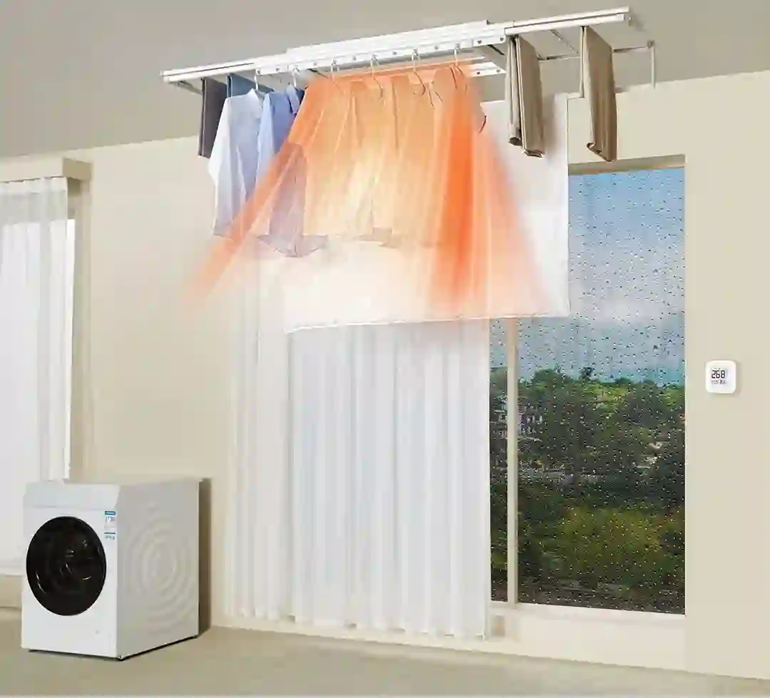 开启急速烘干模式后,晾衣机会向单侧晾杆上挂的衣物集中输送澎湃热量,不但能解燃眉之急,还能让你烘的舒心。