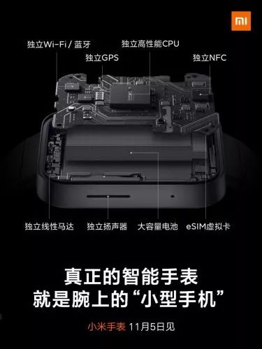 11月3日,小米品牌CEO雷军透露,小米将于11月5日发布一款智能手表,官方给它的定位是腕上“小型手机”。