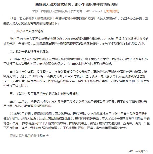 西安航天动力研究所9月27日晚间就网传“张小平离职影响中国登月”一事发布《关于张小平离职事件的情况说明》,称张小平为国家重要涉密人员,离职前须在所内非密岗位进行脱密,脱密期为2年。声明表示,网传材料是承办人为了让其回所脱密向仲裁庭提交的材料,措辞失当,夸大了其在参与研制项目中的地位和作用,引起了一些误解、误读。