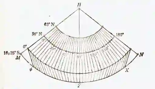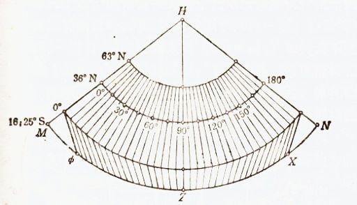 以地区中央垂直经线为中心,其他所有的经线也都被画成曲线,每边18条,每条之间相隔5°;距离中央经线越远,经线的弯曲程度就越大,类似于今天的伪圆锥投影。用这种方法绘制而成的地图,虽然东西距离与南北距离之间的比例更加真实,但绘制起来非常困难,因为任一经线与中央之间的夹角都成了变数。