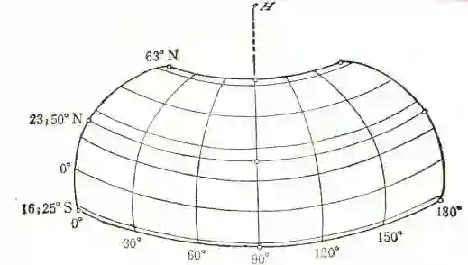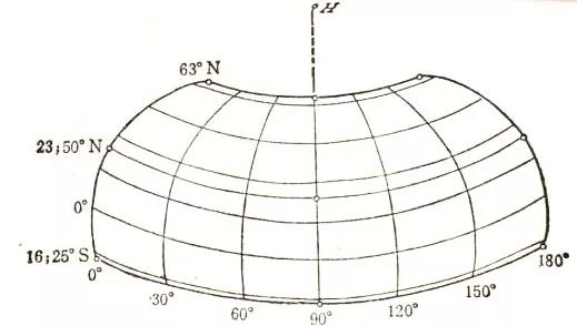 第一种投影法,以悬在北方上空的一个点H为中心,然后画出由这个顶点向南辐射开来的放射状经线;纬线也以这个顶点为中心,呈弧状分布。这种投影法在赤道以北的地区完全符合今天所说的圆锥投影。