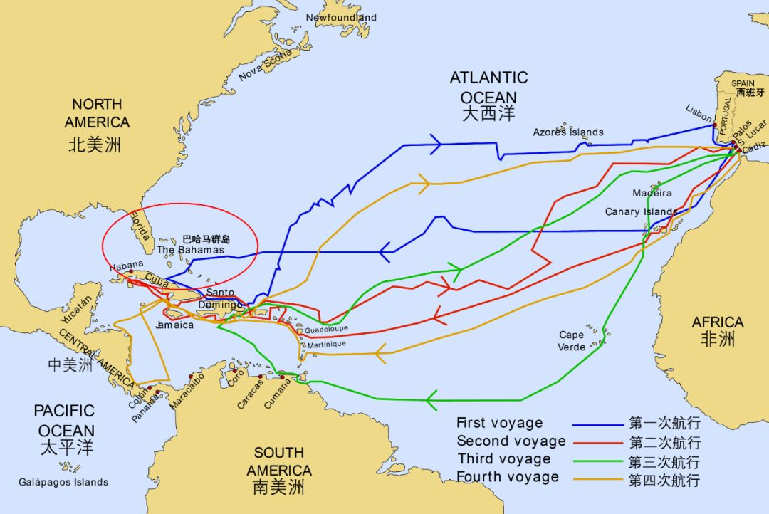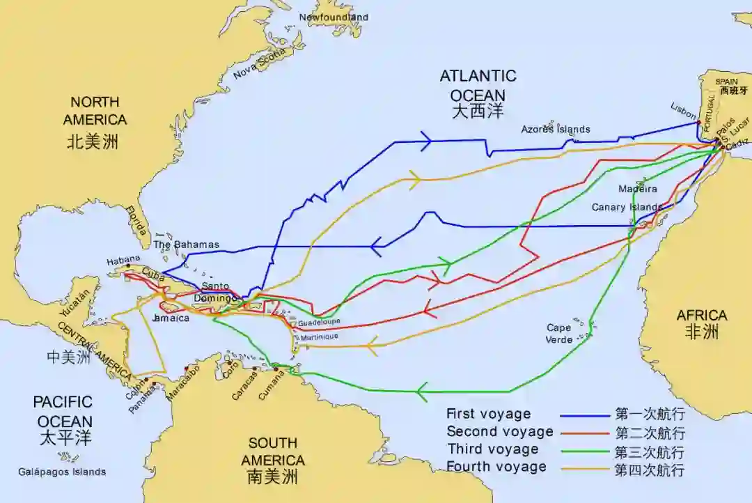 克里斯托弗·哥伦布的4次航行路线 | Phirosiberia/Wikipedia