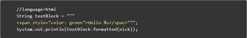 简单多啦,你可以自由写代码,不用担心各种双引号转换的问题,copy分享转换等。稍等,你为何要在 cleanJsonText 前面添加 //language=json ,这个什么鬼?这个是 IntelliJ IDEA 的一个特性,你的 text block 还是有语义的,如是一段HMTL、JSON、SQL 等,添加这个后,马上就代码提示啦。一般人我不告诉他 :)