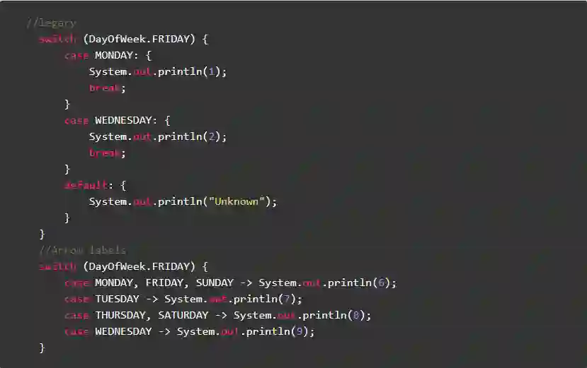 接入了 "->" switch 箭头,不需要写那么多 break 啦,代码如下: