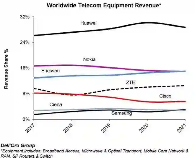 此后华为逐步成为世界领先的通信企业。第三方数据显示,2021年,在全球通信设备市场,华为占据了28.70%的市场份额,同比增长7%,力压爱立信和诺基亚,居于全球第一。