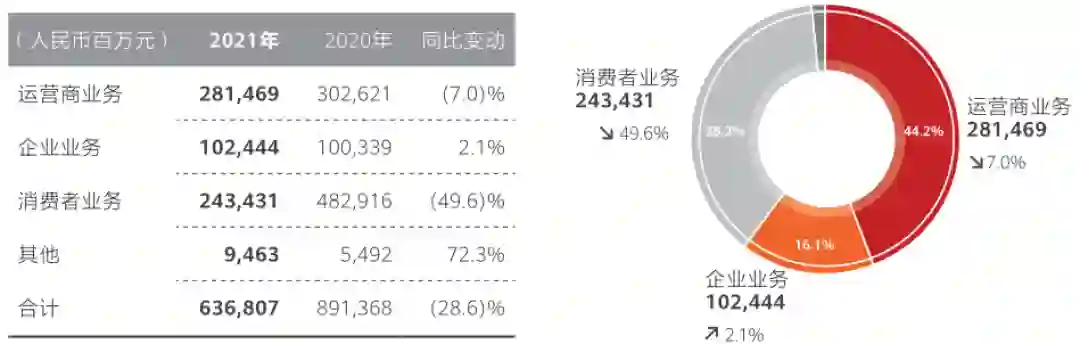 其中,受制裁影响最深的消费者业务同比下滑49.6%,跌回了5年前的水平。运营商业务重新成为了华为营收最高的业务。