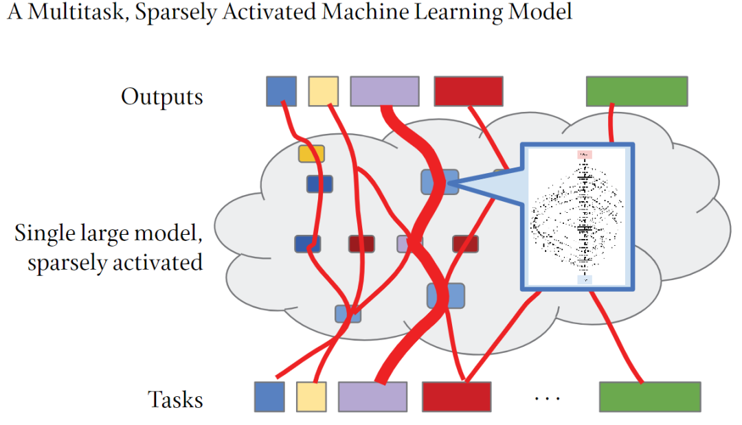一个非常有趣的研究方向是把以上三个趋势结合起来,其中在大规模 ML 加速器硬件上运行一个系统。目标是训练一个可以执行数千乃至数百个任务的单一模型。这种模型可能由很多不同结构的组件组成,实例(example)之间的数据流在逐实例的基础上是相对动态的。模型可能会使用稀疏门控专家混合和学习路由等技术以生成一个非常大容量的模型,但其中一个任务或实例仅稀疏激活系统中总组件的一小部分。