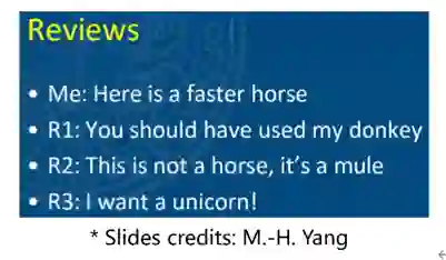 下图来自Ming-Hsuan Yang教授的Slides,生动、形象地描述了作者和3位审稿人在Rebuttal阶段可能存在的矛盾冲突:投稿人自觉论文写的是“这匹马跑得更快”,结果审稿人1说“你应该使用我的驴”、审稿人2说“这不是马,这是骡子”、审稿人3说“我想要的是一头独角兽!”。面对如此情形,你该怎么办?在Rubuttal里面愤慨地直接把审稿人“怼”回去吗?当然不能这样,毕竟投稿人和审稿人是处于一种不对等的地位,我们需要的是端正心态,用平和、专业的态度去把道理解释清楚。