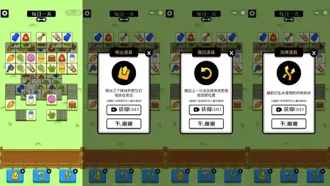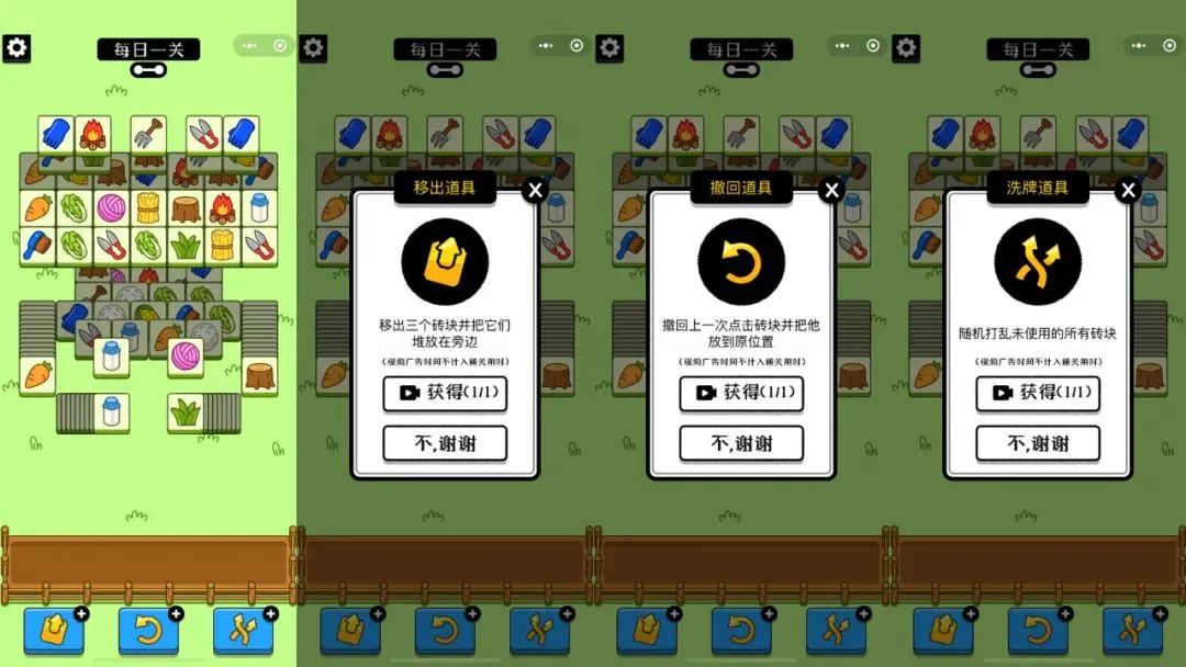 平台内提供移出道具、撤回道具和洗牌道具以及复活等 4 种道具,用户可以通过观看广告视频或者分享到群聊的方式,获取道具。