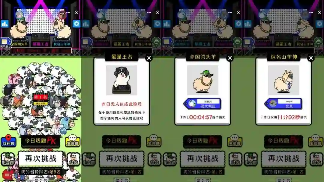 其中,在不使用道具和复活的情况下首个通关的羊可以获得最强王者称号;首个通关的羊可以获得领头羊称号、耗时最短的用户可以获得秋名山羊神称号。