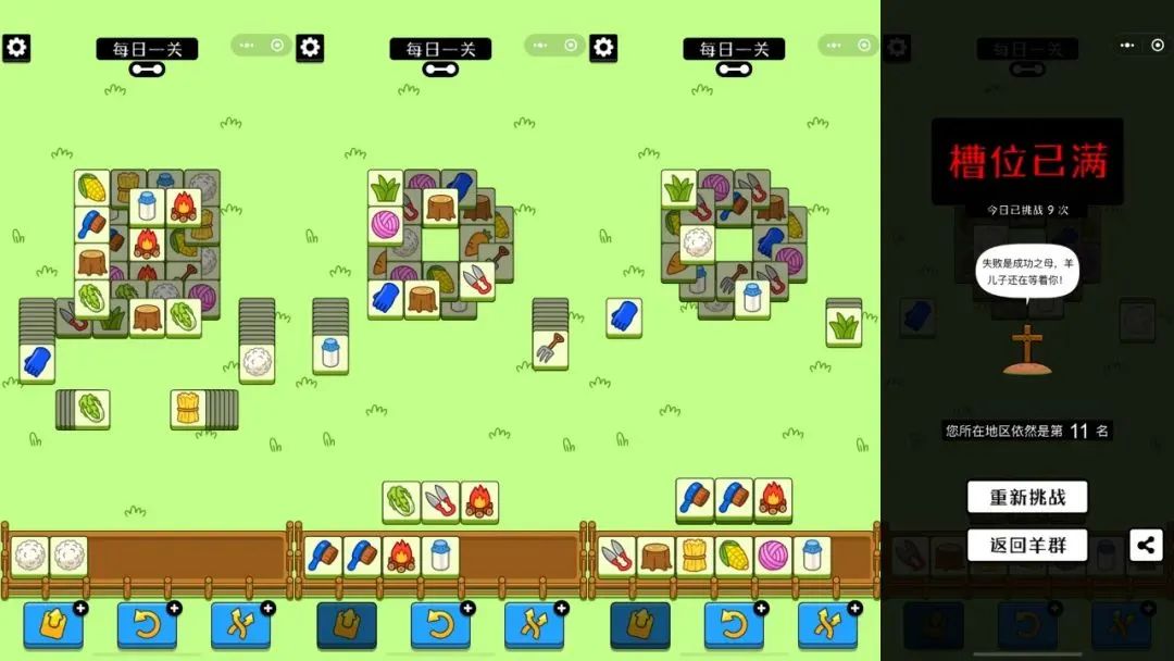 当然,对于一款小游戏而言,社交关系有利于获取新用户、增加产品的打开次数,但最为核心的还是“游戏玩法”,那么同样是三消游戏为何「羊了个羊」能光速出圈。