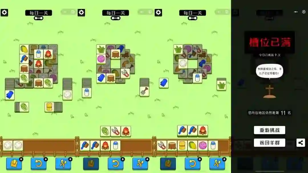 除此之外,「羊了个羊」还采用类 Wordle 的每日一关模式。用户每天仅可通过一个关卡挑战(起玩法介绍作用的第一关不计算在内)。