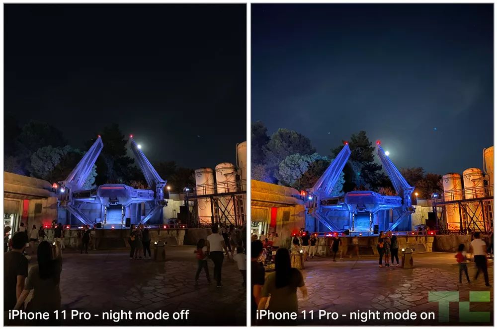 techcrunch 有不同看法,他们认为夜间模式依旧会让你看出这是在晚上拍摄的场景,iPhone 11 并没有让每个角落都变得很亮,只是画面的主体会更加突出,色彩更为饱满。夜拍最佳的效果必须保持静止,包括持握手机和拍摄对象的静止,如果发生移动,那么拍出来的画面会大打折扣。