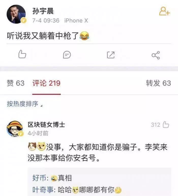 当时,孙宇晨微博称“听说我又躺着中枪了”。而热门评论中网友“区块链女博士”回复:“没事,大家都知道你是骗子。李笑来没那本事给你安名号。”得到许多网友点赞。