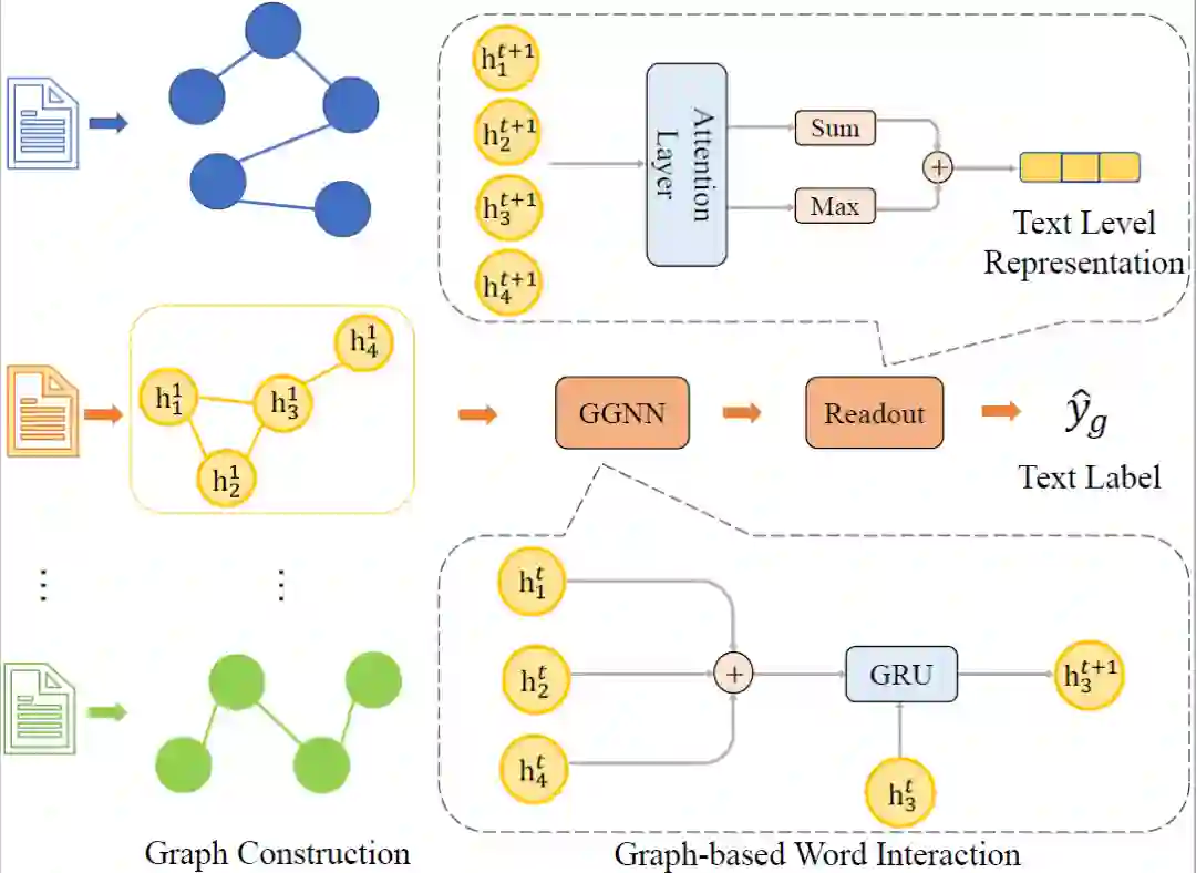 该工作以单词为节点、单词间的共现关系为边,将每个文档构建为拥有自身结构的图,将文本分类任务转化为图分类任务。通过应用图神经网络模型,单词可聚合学习所有关联单词的表示,同时也可捕获中长距离的上下文关系。最后使用最大池化加平均池化的方法,将所有单词聚合为该文本的表示,进而得到其分类标签。