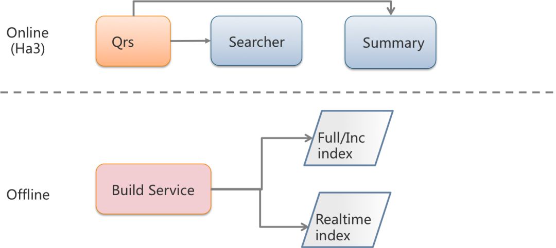 Ha3是搜索体系中的在线部分,在其系统内部,包含Qrs(Query result searcher)和Searcher两种基本的角色。