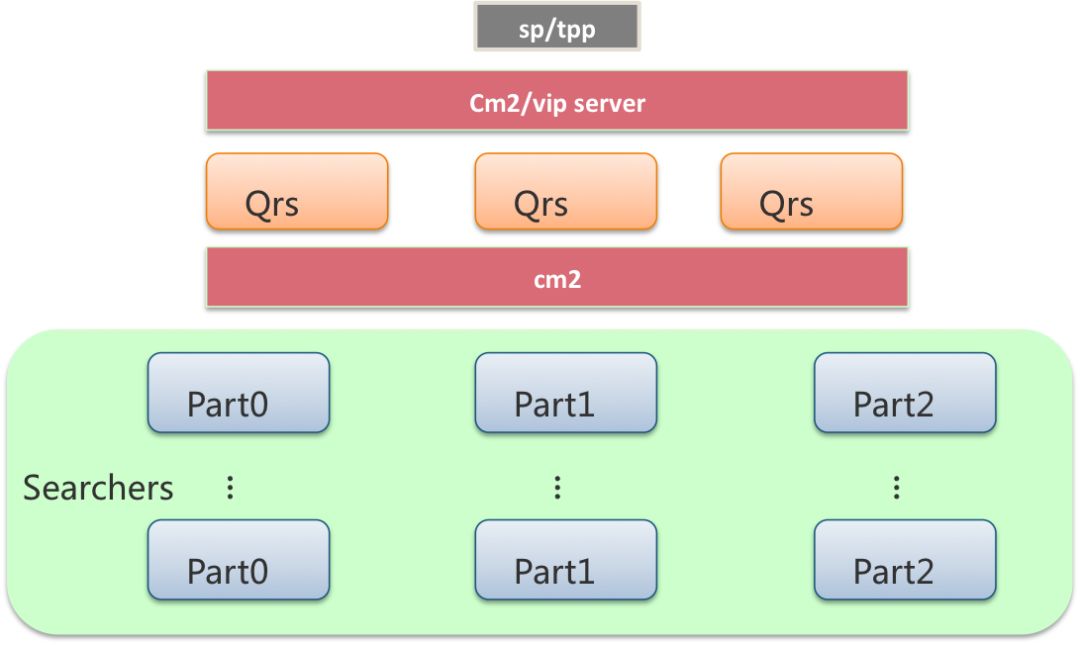 Qrs和Searcher都可以通过运维系统挂载到发现服务上,这里提到的发现服务通常是cm2和vipserver。结合gig 这个搜索团队开发的RPC lib,对Qrs和Searcher的访问均可以做到自动的流量均衡及坏节点检测降级,达到业务上的平稳运行。