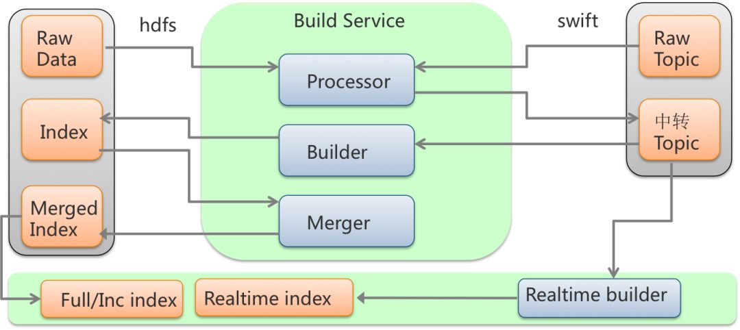 我们把索引数据的生成过程称作离线过程。Ha3的索引是通过搜索团队开发的Build Service系统生成的。