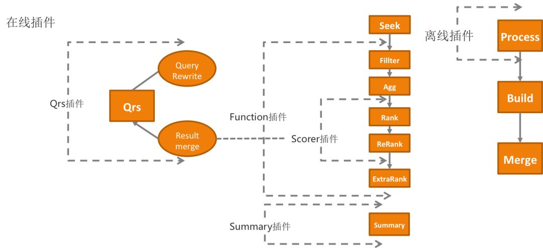 为了实现业务的可定制化,Ha3提供了插件机制。在前文介绍的离线和在线流程的各个环节中,Ha3用户可以通过开发自己的插件,对原始文档、查询Query、召回、算分、排序、摘要做业务上所期望的修改。