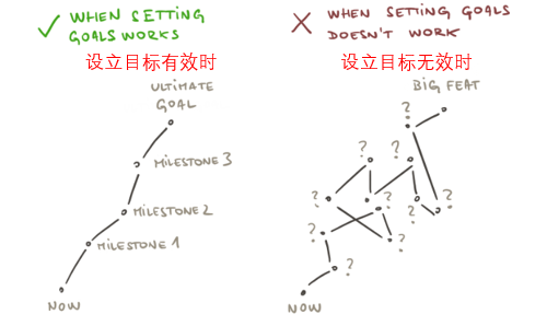 目标虽然功能强大,但却适合于短期任务,即当你现在的位置,和你想要达到的位置之间的路径是清晰的的时候,可以采用设定目标的方式。