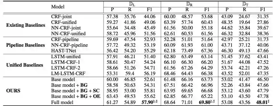 实验上,我们对模型的两阶段分别进行了验证。我们首先针对一阶段 unified aspect extraction 和 sentiment classification 进行了验证,结果如下表。