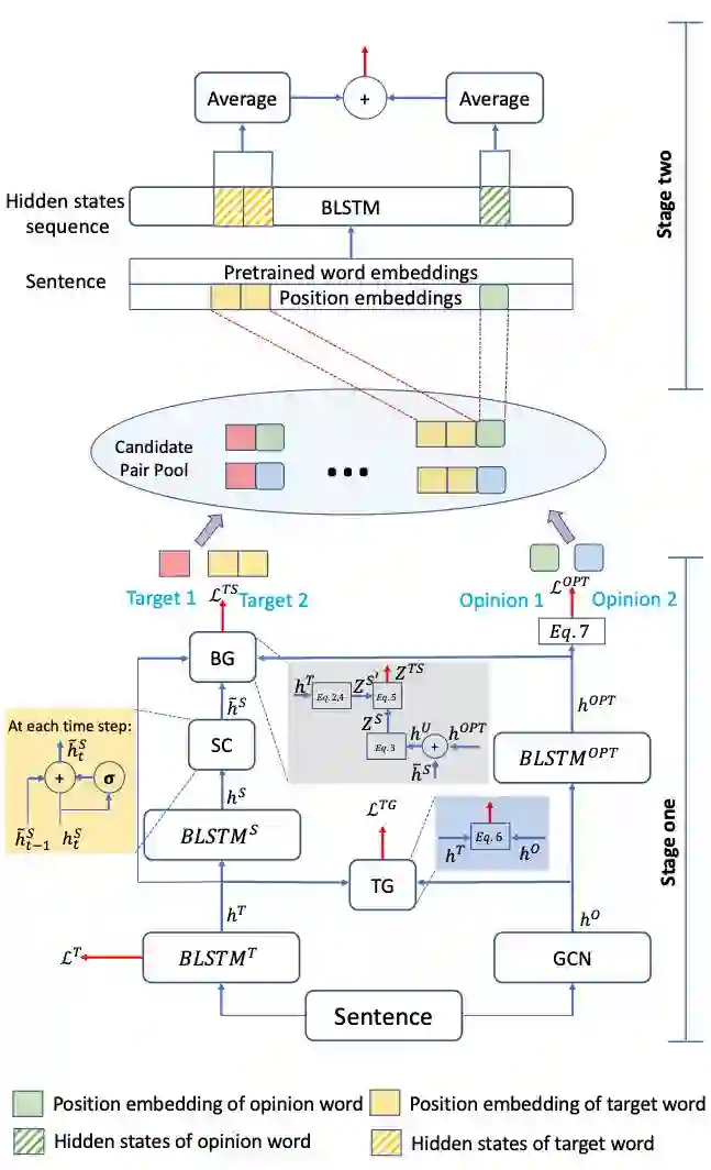 第一阶段模型是基于前述 E2E-ABSA 工作的改进。第二阶段模型(stage two)对第一阶段模型左侧输出的带情感的目标词和右侧输出的情感词进行配对。首先我们枚举可能出现的配对,加之文本信息以及目标词和情感词之间的距离信息通过分类器来确定哪些是有效的组合。