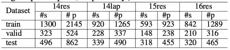 上例中包含两个 aspect-opinion 对:‘price’—‘best’和‘feature’ —‘newer’。我们同时也清除了少量的 aspect 标注和 opinion 标注有重合的数据。最终数据集统计如下: