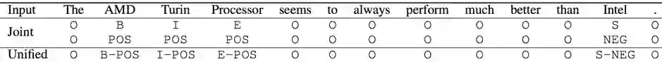 如下图中的“Unified”行所示,除了 O 之外的每个标签的组成元素都包含位置(B/I/E/S)和情感标签(POS/NEG/NEU)。在这种标注模式下,输入为单词序列,输出为每个单词对应的 unified tag。