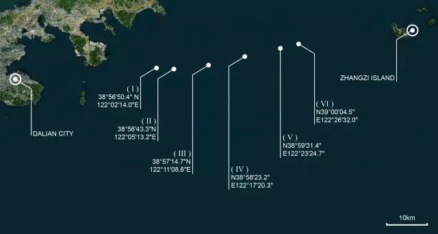 首先,是海水对光的损耗问题。在海水中,很强的吸收和散射看起来对光的传输非常不利,这也是为什么海水乍看起来并不是做为量子通信的好的介质。克服这个困难的方法是利用405nm的光子,这个波段位于海水的“蓝绿窗口”,在此窗口内,海水的吸收较其他波段要弱。为了验证海水作为量子通信信道的可行性,并不失一般性,他们在提取海水样本时,均取自大连市到獐子岛之间沿岸海域不同位置的表层海水(见下图)。