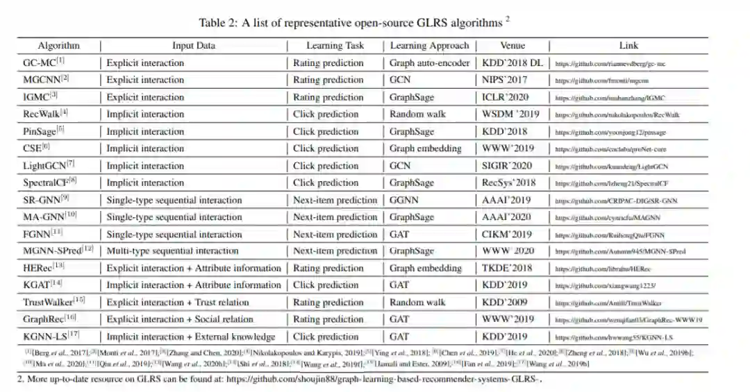 推荐系统(RS)是人工智能(AI)最流行和最重要的应用之一。它们已被广泛采用,以帮助许多流行的内容分享和电子商务网站的用户更容易找到相关的内容、产品或服务。与此同时,图学习(Graph Learning, GL)是一种新兴的人工智能技术,它涉及到应用于图结构数据的机器学习,近年来发展迅速,显示出了其强大的能力[Wu et al., 2021]。事实上,得益于这些学习关系数据的能力,一种基于GL的RS范式,即基于图学习的推荐系统(GLRS),在过去几年中被提出并得到了广泛的研究[Guo等人,2020]。在本文中,我们对这一新兴领域的挑战和进展进行了系统的回顾。